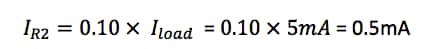 Let’s talk a moment about how to decide the resistor values you will need for your voltage divider. To do so, you must take into account the load that will be connected to the output of the voltage divider. Let’s assume our load is 1KΩ and requires 5V at 5mA. We now apply the “10% Rule” so that the “bleeder current” through R2 is 10% of the current that we want to follow though the load. In this case: