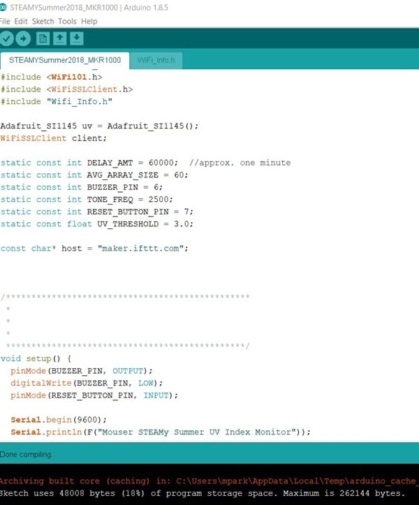 Tagged With: Arduino MKR1000, Bill of materials, BOM, Breadboard, Cloud, Google Sheets , Li-Po battery, Lithium polymer, Sensors, Si1145, Silicon Labs, TDK Corporation, Ultraviolet radiation, UV monitor and alert project