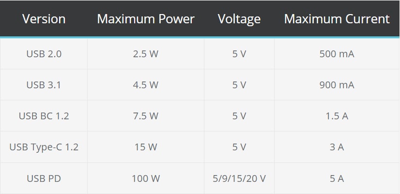Table 1: Evolution of USB power levels. (Source: CUI)