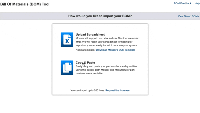 La herramienta BOM de Mouser le permite importar sus datos de dos maneras: